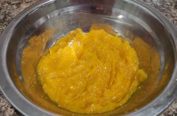 2、将蒸好的南瓜取出,用叉子捣成泥状备用。