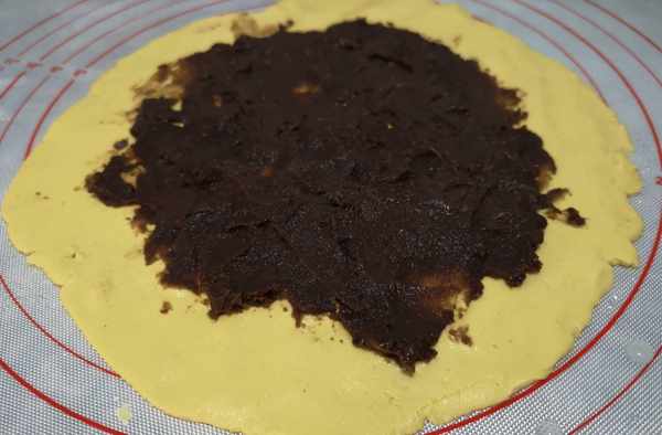 5、面片的中间抹上一层红豆沙,边缘要空出一些来,这样可以避免卷起来的时候馅露出来。