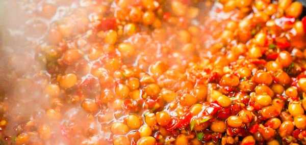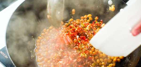 准备一个干锅,里面倒入大约半碗大豆油。起锅烧油等油温5成热也就是微微冒烟时下入刚才控水的黄豆翻炒,顺便把盆里粉碎的调料下入锅中炒出香味。再次倒入多一些的大豆油炖煮几分钟然后关火。