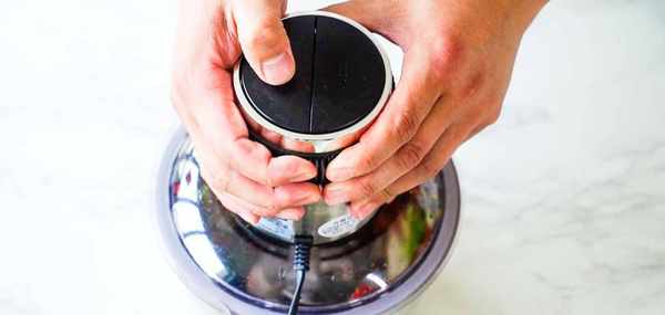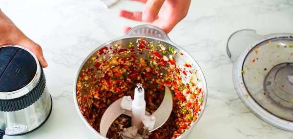 调料都准备好了我们拿一个大点的料理机,在里面撒上刚才的辣椒面、葱花和切好的青椒红椒。倒入去皮的大蒜和冲洗过的剁椒,盖上盖子启动料理机粉碎。这里不要把调料粉碎得太小不然影响美观与口感,粉碎完成后倒入一个不锈钢盆中。