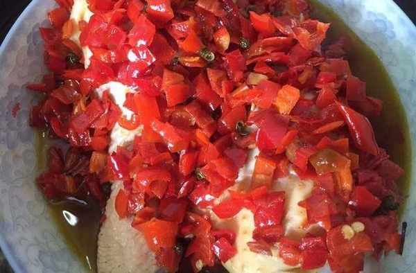 4.锅里倒油,油热加入葱姜蒜,香叶、八角、桂皮,香料炸干了之后捞出来,加入剁椒(尽量覆盖鸡腿的量),翻炒一下,加点干花椒,炒香了之后淋到鸡腿上面。