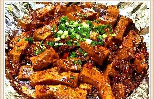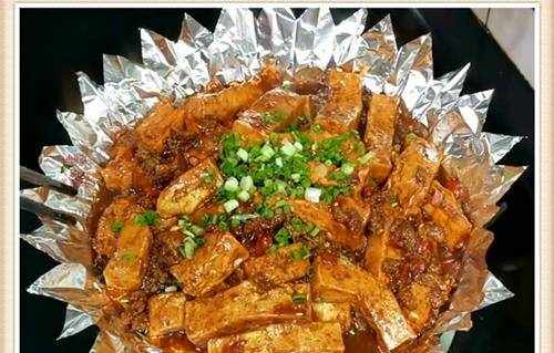【第四步】:最后准备一块铁板或是小铁锅都可以,在锅里放入一张锡纸,(如果家里没有锡纸,也可以不放,直接把豆腐放铁板上)把烧好的豆腐倒入锡纸上面,开中小火把铁板烧热,在豆腐表面撒上葱花,淋上一点芝麻香油,然后豆腐里面的汤汁就像烧开了一样,咕噜咕噜的冒着香气,然后就可以端出来端上桌了。
