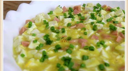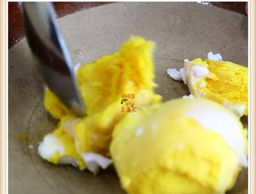 【第一步】:做这道菜的时候是需要选用比较硬朗一点的北豆腐,这种豆腐含水分比较少一些,细嫩的豆腐给它切成小一点的方块,切豆腐的时候要慢慢切,不要把它切碎了,另外准备一根火腿肠切碎备用,咸鸭蛋煮熟之后蛋黄蛋白分离开来,蛋白用刀把它切碎放入装有火腿肠的小碗里面,蛋黄用勺子给它按压成蛋黄泥即可,