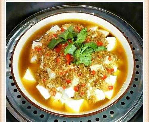 【第四步】:然后蒸锅里加入冷水放入蒸帘,把沥干水分的豆腐装入碗里面,放进蒸锅,然后再把炒好的辣椒酱浇在豆腐上面,尽量淋得均匀一些,水烧开之后加上锅盖,开大火蒸8分钟,蒸好之后开盖即可端出来,然后马上在上面浇一勺蒸鱼豉油,再放入香菜叶子做点缀就大功告成了。