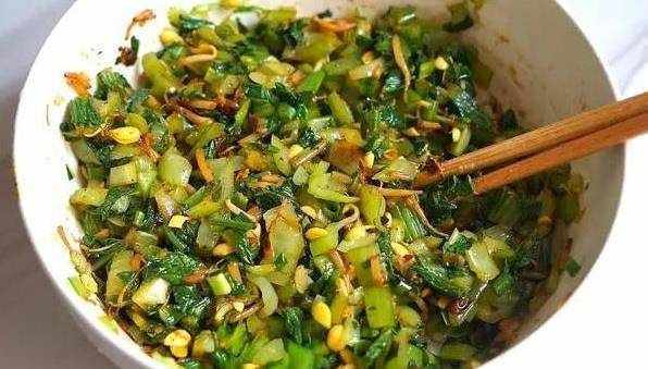 4、切碎的上海青和豆芽搅拌在一起放入胡椒粉、辣椒面、盐、鸡精调拌好。(喜欢鸡蛋的或者粉丝的也可以放一些进来)