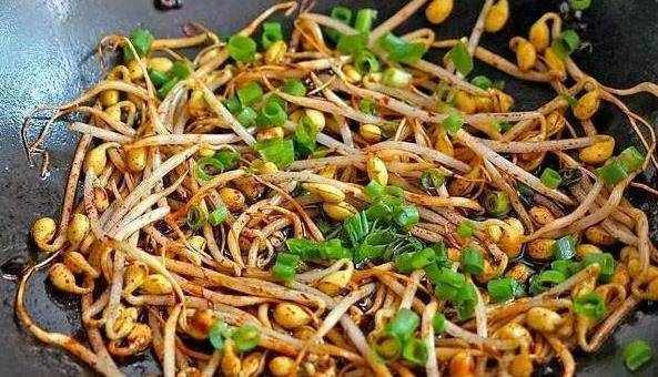3、热锅烧油放豆芽翻炒一会儿后放酱油焖1分钟,然后撒上葱花。豆芽炒好后盛出来放凉切碎。