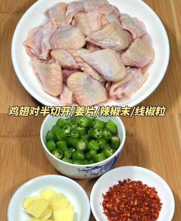 【爆炒辣鸡翅】准备食材:鸡翅一斤,线椒,辣椒面,生姜,小葱,花椒。