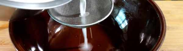 让他醒发两个小时以上,把洗出来的面粉用漏勺给它过滤一遍,面水静止6小时以上,天气热可以放冷藏静止,面巾发好了,上锅给他蒸熟就可以了。面水静止好以后,滤掉多余的水,小面胡是成败的关键,搅拌面糊的时候一定要加入适量清水,面湖也不能太细,干了容易裂蜥了,不成块,用勺子块、曲面弧有挂浆杆就可以了。