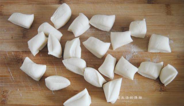 4,饺子粉加入适量的清水和一勺花生油揉成光滑的面团,分成15克左右大小的剂子。