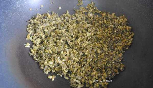 2,先将酸菜切碎,放入锅里翻炒干水分,这样处理过的酸菜才香味十足。