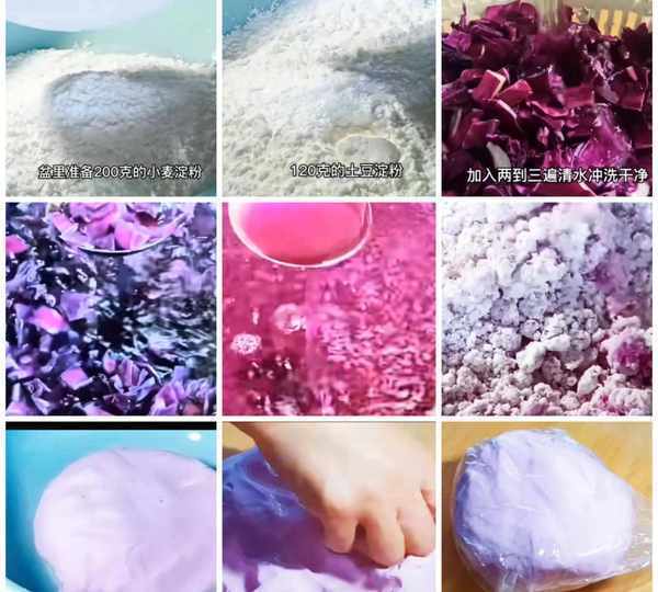 6.要保持紫甘蓝水的沸腾状态,紧接着把开水倒入准备好的面粉,少量多次地加入,要把全部的面烫匀,大约用了270克的紫甘蓝水,因为面的含水量不一样,用水量可以适当增减,但一定要开水烫面,下手揉成光滑的团后,再放到案板上加入少许的食用油,如果有猪油的话可以加一些猪油,这样蒸出来的饺子会更加的光亮,在面板上多揉一会儿揉好后要及时装入保鲜袋内,放一边先醒10分钟。