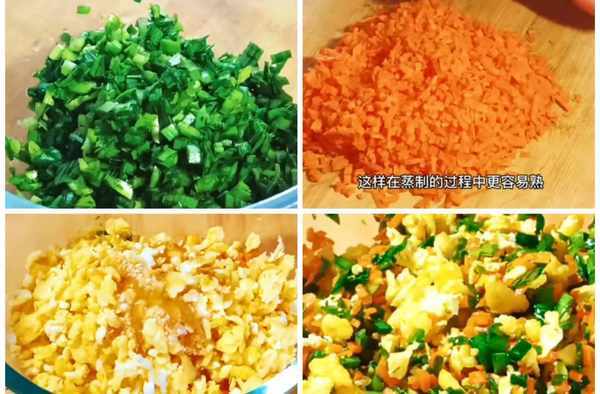 1.首先准备馅料,把洗净控干水分的韭菜切成碎末,再准备半根胡萝卜,切成小丁,胡萝卜要切得碎一些,这样在蒸制的过程中更容易熟,再加一些晾凉后的鸡蛋碎。