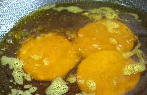 5,起锅烧油,油温五成热改成小火,下入沾好面包糠的饼坯,炸的过程中用勺子在饼皮上不断的浇油,使饼皮受热均匀。1分钟左右翻面饼皮就会慢慢地鼓起来,完全鼓起,炸至两面金黄即可出锅。