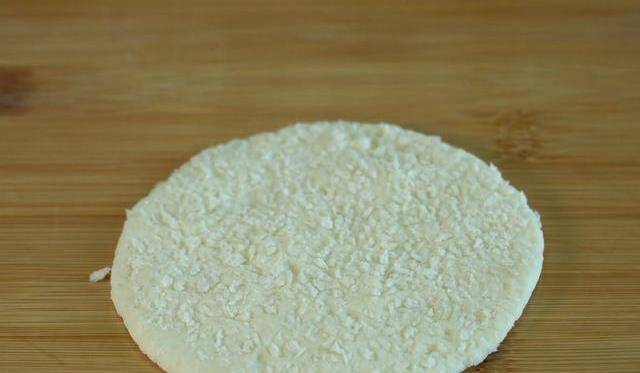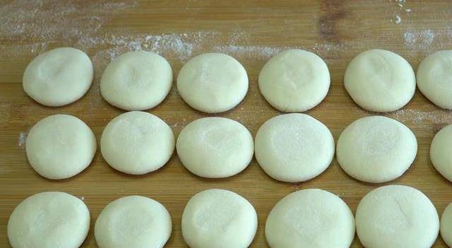 3,搅拌成面絮之后下手揉成光滑的面团,再把面团搓成长条,分成大小均匀的小面挤按扁备用,面挤不需要太大,大约35克左右即可。盖上保鲜膜防止表面变干。