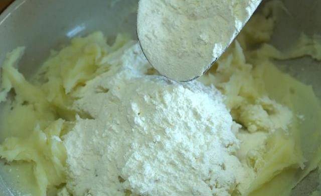 2,蒸熟的土豆倒入盆中,用擀面杖捣碎,捣成细腻的土豆泥。趁热少量多次地加入面粉,不需要加水,一加一边搅拌成面絮。