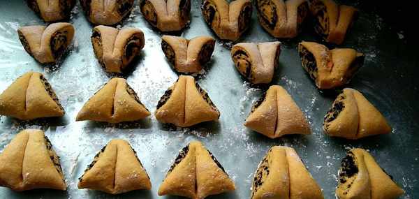 8、从面饼的一边慢慢卷起,成长条状,用刀成一头宽一头窄的梯形。