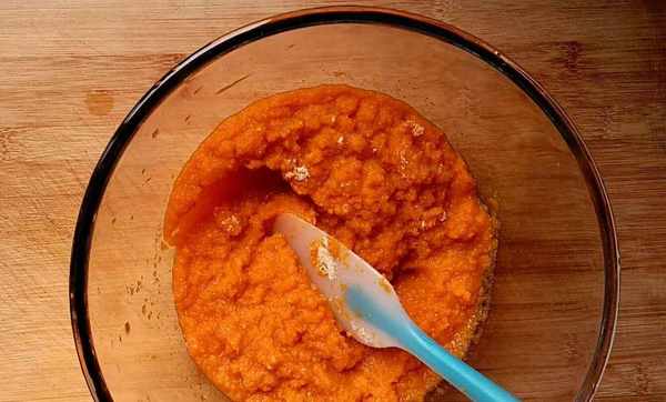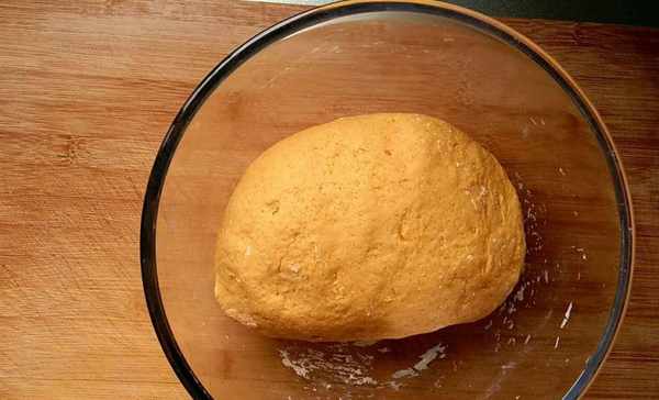 4、将500克左右的面粉,分次加入到南瓜汁里(南瓜的含水量不同,面粉适当增减),揉成光滑的面团,密封发酵40分钟左右。