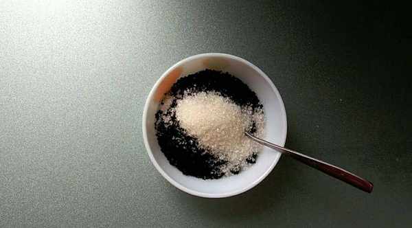 6、取半碗黑芝麻碎,加入两勺白糖,拌匀。