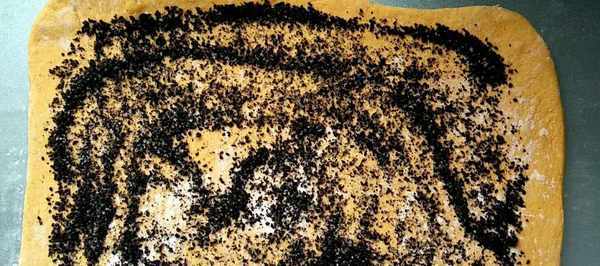 7、将面团分成两半,取其中的一半,擀成长方形的薄饼状,将黑芝麻均匀的撒在面饼上。
