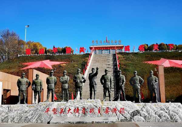 怀着沉重的心情继续前行,来到平型关大捷纪念馆,映入眼帘的是人物雕像,林彪、聂荣臻、萧华等10人傲然挺立于天地间,雕像背后,是115层直插云霄的台阶,寓意着115师抛头颅,洒热血的豪情壮志。