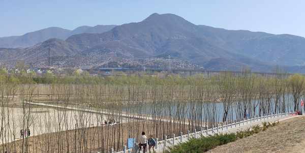 八年前,我和宝哥偶然发现,位于门头沟琉璃渠村对面沿永定河两岸已经修建好步道,种植了很多绿植,春秋不是节假日,人很少。喜欢安静的我们俩。从此就把这里作为我们休闲散步的场所,每年都会过来几次,当时永定河水还不多,通过修建的石墩可以往返河两岸,由此,我们发现河对岸就是门头沟曹家沟车站附近还有免费停车场,再后来发现再靠北,还有个京浪岛公园,我们见证了几年这里的变化,最近这两、三年这里已经变成京西休闲娱乐的网红地。