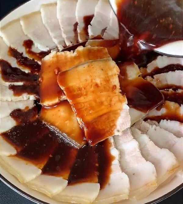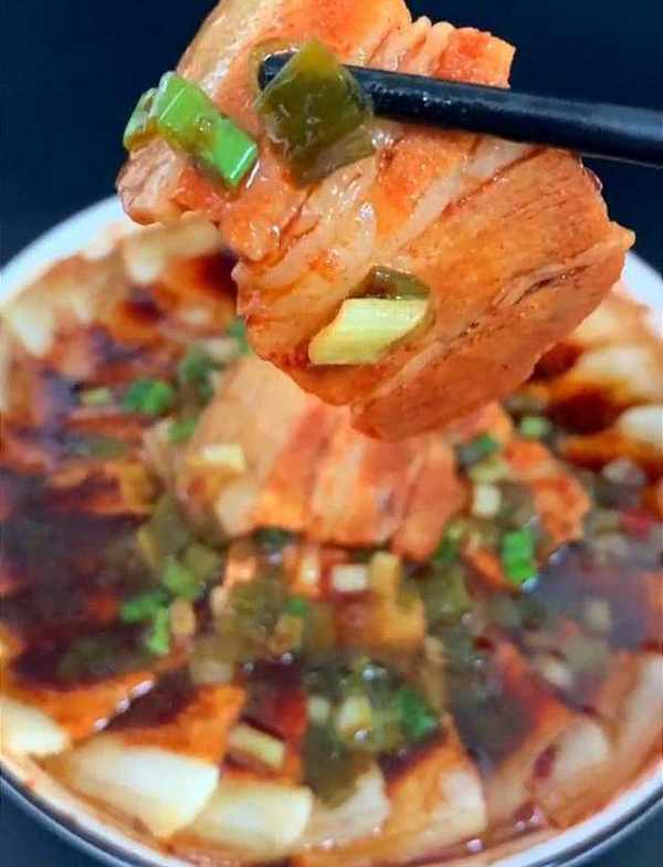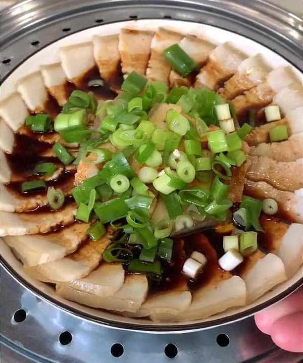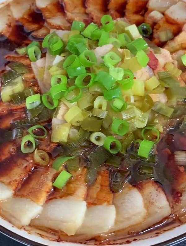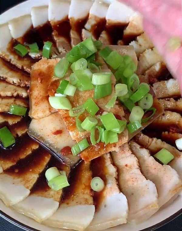 30分钟过后,把煮好的五花肉切成薄片,摆入盘中,再把调好的料汁倒到五花肉上面,接着再放一些葱花,把它放入蒸锅,上面扣一个盘子或者封上耐高温的保鲜膜,把它蒸30分钟以上。