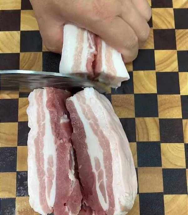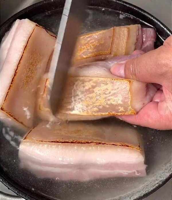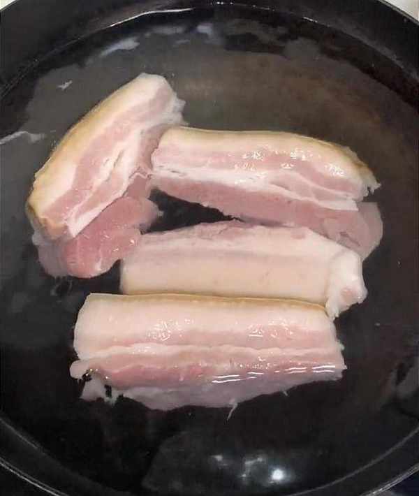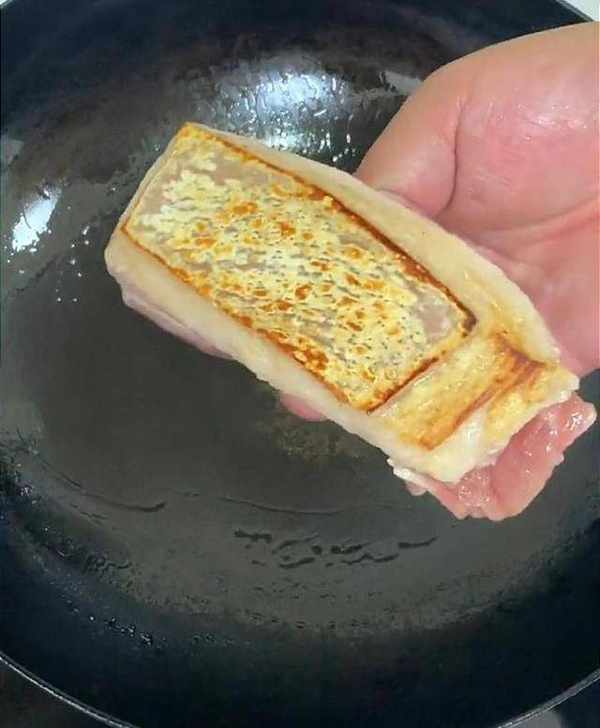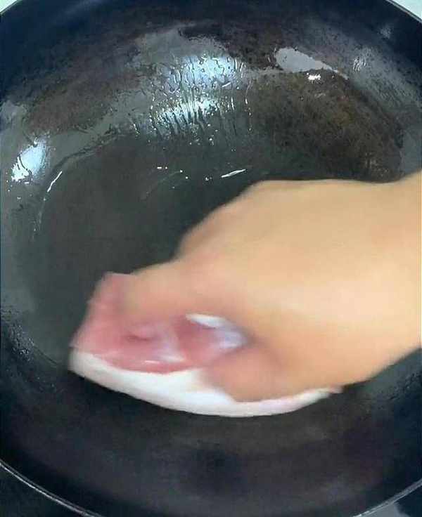 接着,空的炒锅烧热,五花肉的皮朝下,在炒锅里面给它蹭一蹭,这样能去除猪毛味。