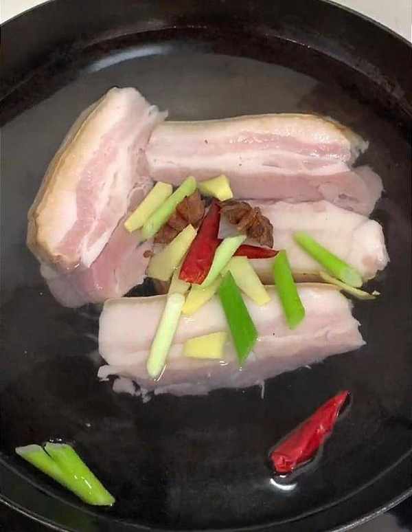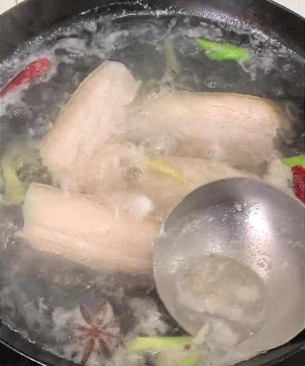 然后,再把蹭过的五花肉清洗干净,冷水放入锅中,加入葱、姜、八角、干辣椒,开小火煮30分钟。