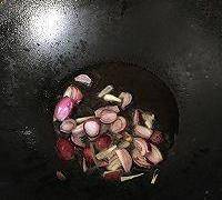 锅里放油,四个红葱头切片放入油中中火炸至金黄
