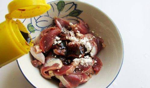 将鸡胗加入少许淀粉、生抽、老抽、料酒抓匀腌渍一会儿
