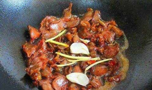 热锅注入油烧制7分热,倒入鸡胗爆炒