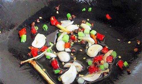 另起一锅,注入油将辣椒、蒜头等炸出香味