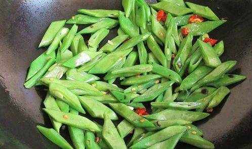 倒入豆角干炒,炒至变色九分熟