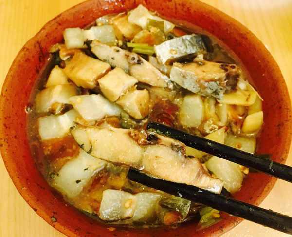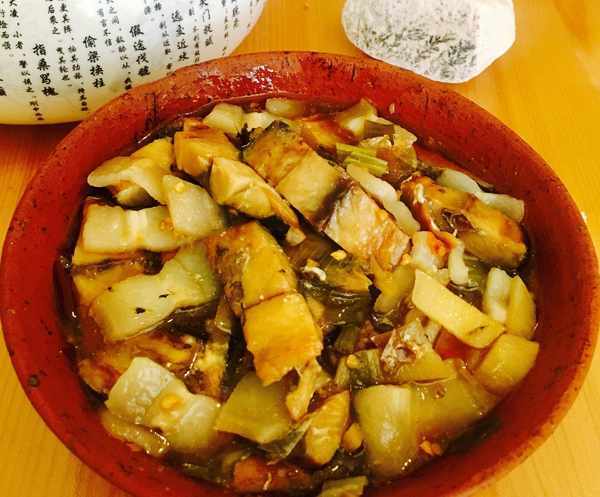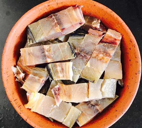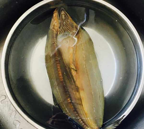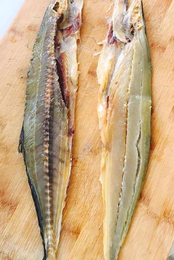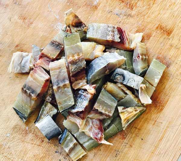干咸鱼一条大约400克左右用清水冲洗干净,浸泡3到5分钟使干咸鱼变软,浸泡好的咸鱼切去鱼头和鱼尾,从中间切开一分为二,再切成大约一指宽的块状