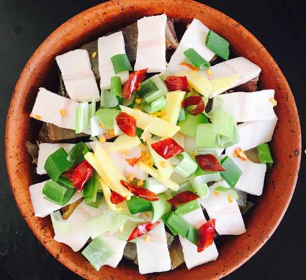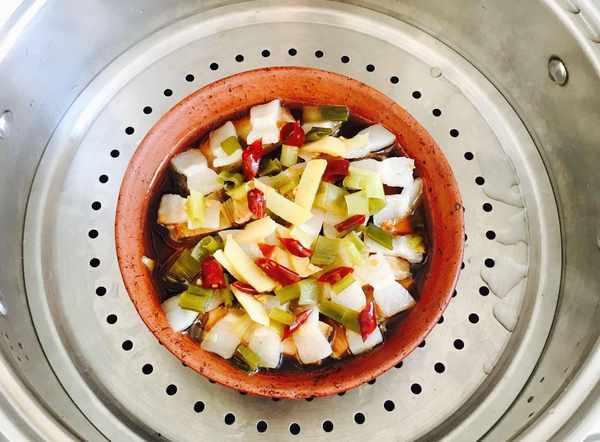 摆好肥肉片后依次放入切好的葱花、姜片、干红辣椒段,倒入适量的料酒和味极鲜酱油。因为肥肉片在蒸制过程中会出油,所以不用再加植物油。