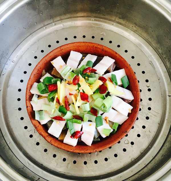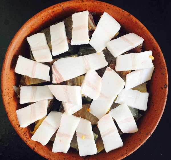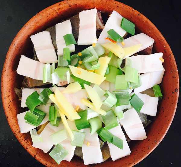 把切好的咸鱼块放入砂碗中,因为听长辈说砂碗蒸出来的咸鱼味道好。再把肥肉片均匀的摆在鱼块上面。