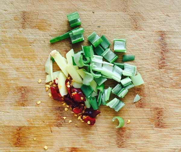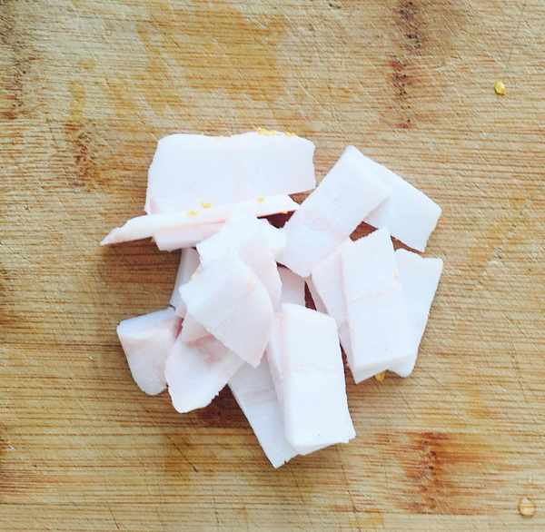 葱、姜剥去外皮清洗干净,分别切成葱花、姜片,干红辣椒去蒂洗净切成辣椒段,猪五花肉用温水冲洗干净,用刀切下比较肥的一块儿,切成厚薄均匀的肥肉片