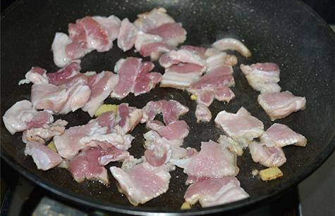 4.起锅烧油,少放点油就行,油温六成热时,放入姜片,下入切好的五花肉片,铺满锅底煎制。厨艺小白炒肉菜一定要用不粘锅,而且这道菜倒油只用一点点就好,因为我们把五花肉煎了之后,里面的油脂就会被煸出,倒太多油反而成菜就腻了。