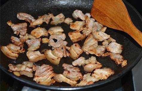 5.一直要用中小火煎,待五花肉一面煎好后再煎另一面,直到如下图煎出五花肉油脂,并且二面呈金黄色时将煎好的五花肉盛出备用。