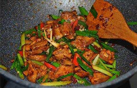 7.接着加入蒜苗的蒜白的部分翻炒均匀;转大火,加入料洒用快速翻炒均匀;加入白砂糖和少许胡椒粉,加入蒜苗叶炒至断生,撒入咱们准备的葱段和红辣椒段,快速翻炒均匀。出锅前加入少量的料油或香油即可装盘。