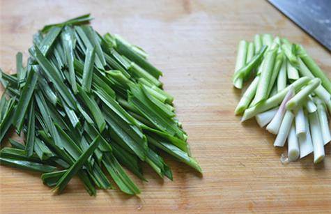 3.蒜苗摘洗干净,也斜切成段,将蒜白和蒜青分开备用。如果家中没有蒜苗了,现在蒜薹正是时令菜,可以用还便宜,如果连蒜薹也没有,那就多切一点大葱白,炒出来也非常好吃。