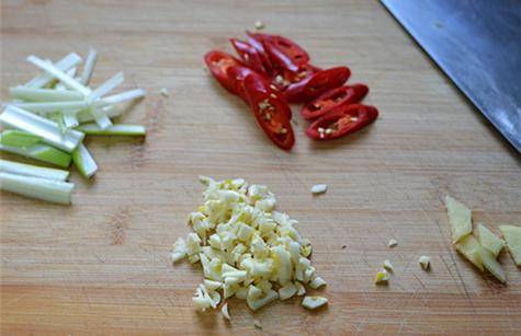 辅料:蒜苗1小把,红辣椒1个,姜2片,蒜5瓣,葱白1小段