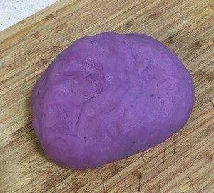 紫薯蒸熟后捣成泥状,和面粉,水,发酵粉一起放入面包机烤盒,开启面包机的面团模式,1个半小时后搅拌和发酵全部完成。