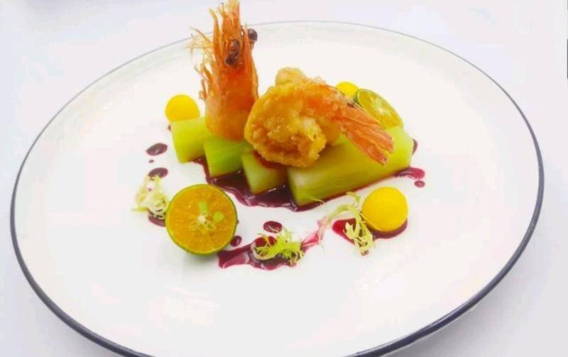 起锅烧油,油温6成热,放入虾球炸至酥脆捞起,放入虾头炸酥脆装盘淋上桑葚酱汁即可