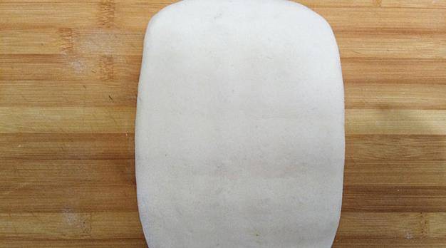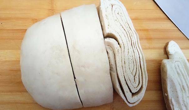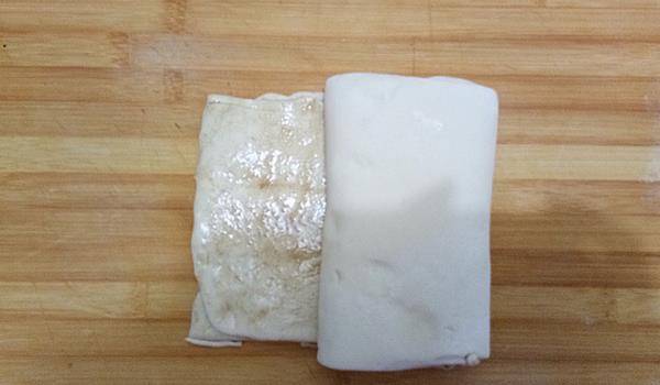 切好的两片面皮叠起,从一头卷起。(卷的次数越多,层次越多)。