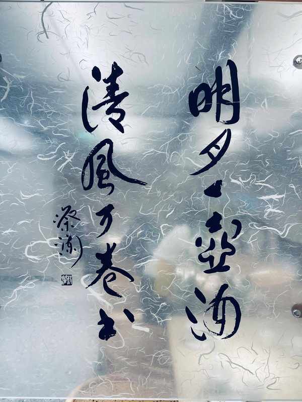 蔡澜港式点心店内屏风上的字贴是“明月一壶酒、清风万卷书”、茶壶上的字“吃好喝好”,均来自先生亲笔书写。