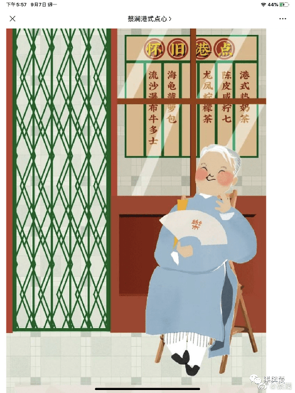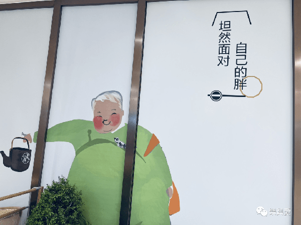 蔡澜港式点心重庆店门口的先生肖像画,就来自苏美璐女士,一副是提着茶壶、背着和尚袋,笑呵呵的先生,仿佛在说:“请喝茶”。