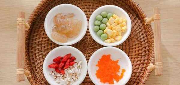 辅料:虾仁,鱼子酱,豌豆,玉米粒,枸杞,香菇碎