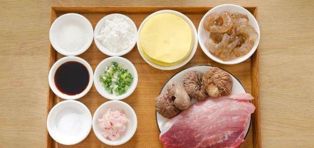 30克干蘑菇/200克、猪肉/30克、猪肉/150克、虾仁/1匙、盐/1匙(2克)、2匙生抽/2匙(10g)、1匙玉米淀粉/2匙(约10g)、细砂糖/1勺(约5g)、烧麦皮/适量、葱花/适量
