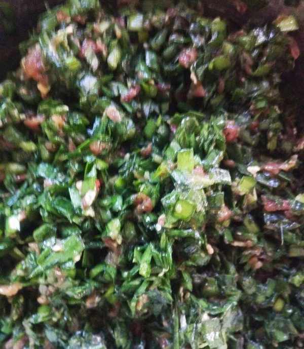 牛肉馅腌渍好,韭菜洗净切碎拌入搅匀。